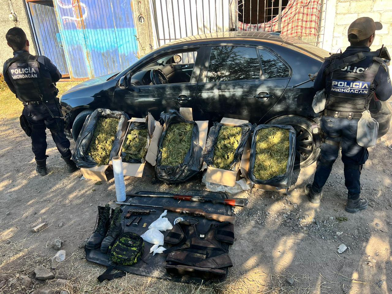 Morelia, Michoacán.- Como resultado del reforzamiento de las tareas operativas para disuadir hechos ilícitos, los elementos de la Secretaría de Seguridad Pública (SSP) efectuaron el aseguramiento de cinco cajas con marihuana, tres bolsas con metanfetamina, tres armas de fuego, dos vehículos y diversas prendas de equipo táctico.