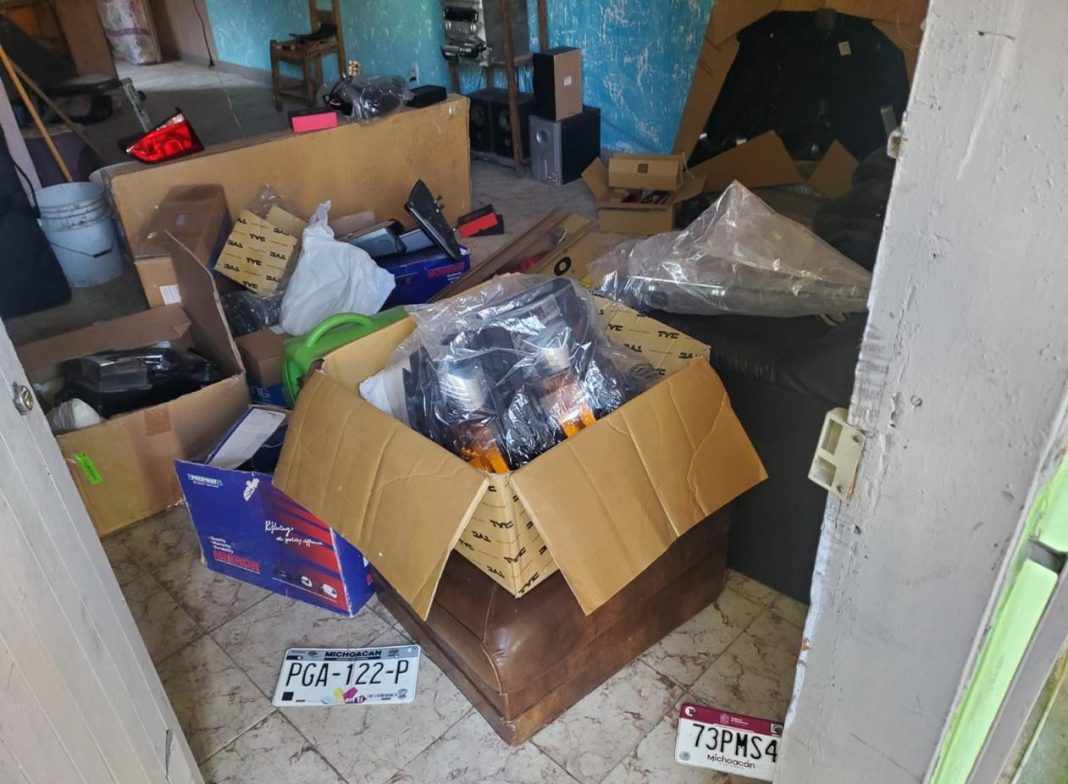 En el lugar fueron localizadas diversas autopartes nuevas, así como juegos de placas de circulación de distintas entidades, entre ellas Michoacán, Texas y Ciudad de México. Asimismo, se aseguró una placa de con reporte de robo ocurrido en 2018 y que estaba relacionada con un vehículo que ya había sido recuperado con anterioridad.