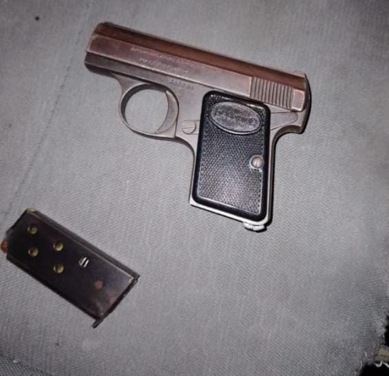 Al realizar una revisión, al imputado le fue encontrada entre sus pertenencias una pistola calibre .25 milímetros, un cargador abastecido y 5 cartuchos útiles, por lo cual fue puesto a disposición de la autoridad competente a efecto de llevar a cabo las diligencias que marca la Ley.