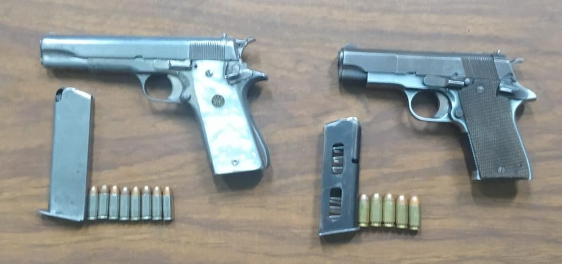 Por lo anterior, al realizarles una inspección, les fueron encontradas entre sus pertenencias dos pistolas calibres .45 mm., y .9 mm., respectivamente, así como 13 cartuchos útiles y dos cargadores, procediendo al aseguramiento de los implicados para su puesta a disposición de la autoridad competente, a efecto de realizar las diligencias correspondientes.