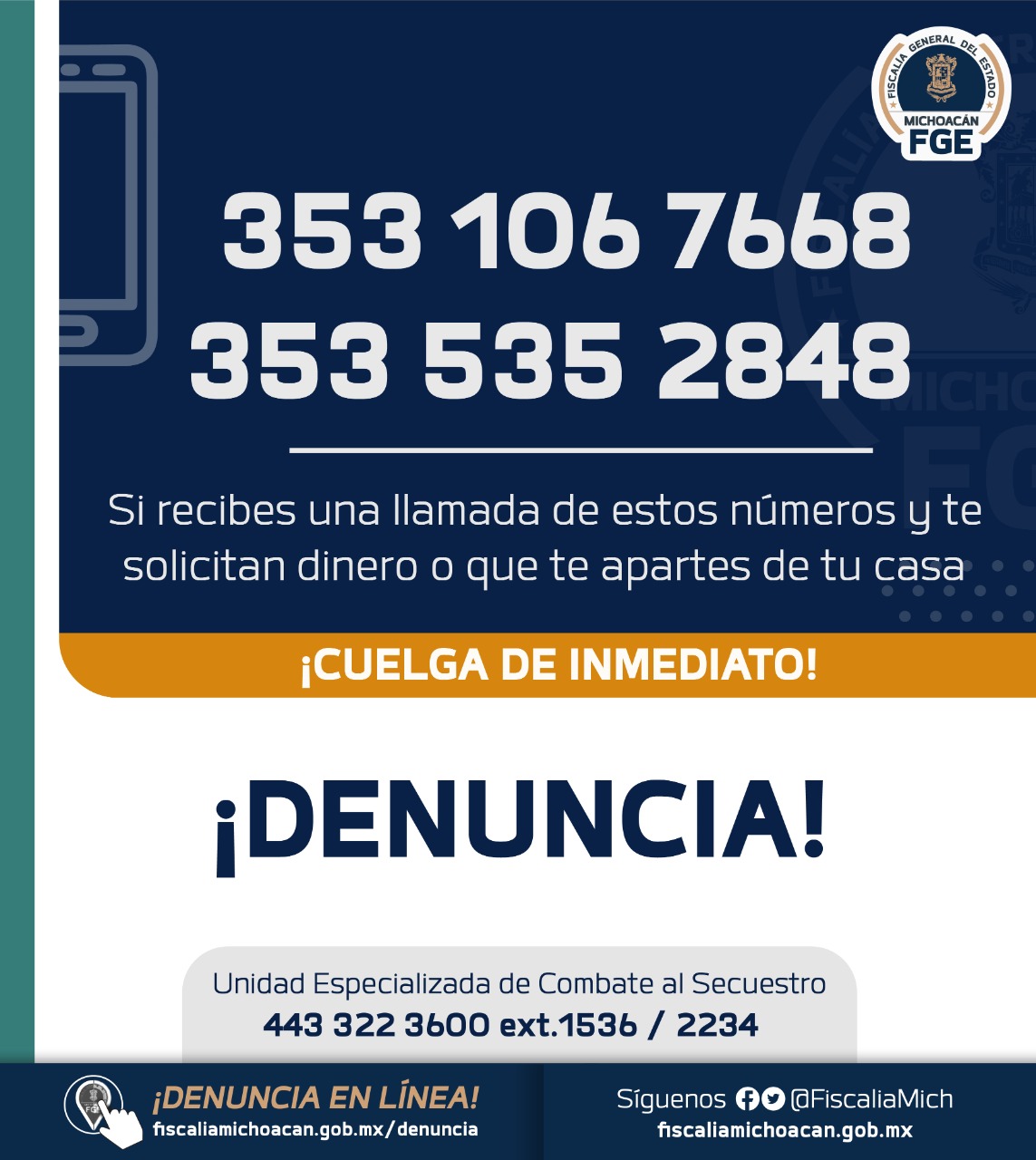La FGE solicita a la población a no atender este tipo de llamadas y denunciarlas de forma inmediata ante la Fiscalía Regional más cercana, o bien, a la Unidad Especializada de Combate al Secuestro, ubicada en Periférico Independencia #5000, colonia Sentimientos de la Nación en Morelia, o comunicarse al teléfono 443 322 36 00 extensión 2234.