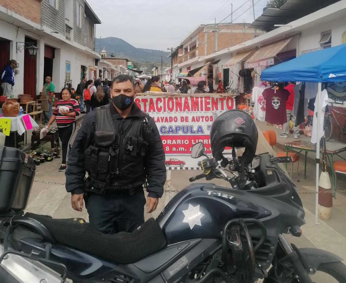 Morelia, Michoacán.- Elementos de la Policía Morelia, mantienen la implementación de un dispositivo de vigilancia para garantizar la seguridad de los asistentes a la Feria de la Catrina, que se desarrolla en la tenencia de Capula.