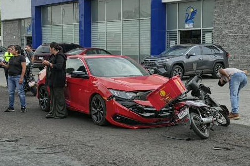 Zamora, Mich.- 20 de abril de 2026.- Un empleado del negocio «Jimmy’s Chiken» resultó con algunos golpes y raspones luego de que chocará la moto en la que viajaba contra un automóvil que aparentemente intentó ganarle el paso.