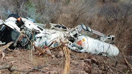 Se supo que al circular por las curvas de la vialidad antes referida, en un momento determinado el vehículo de carga se precipitó a una barranca, el conductor alcanzó a salir de él y la unidad quedó completamente destrozada.