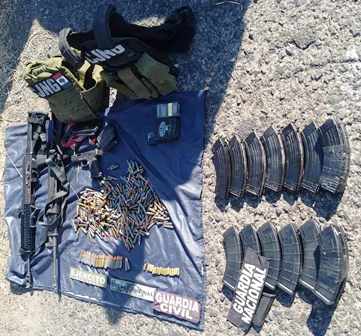 De inmediato, los agentes y militares persiguieron la mencionada unidad y tras darle alcance revisaron a los ocupantes Abelardo «El Greñas» y Cristian «El Maicol», ambos originarios del estado de Jalisco, a quienes les aseguraron dos rifles de grueso calibre, una pistola calibre .9 milímetros, 450 cartuchos útiles, 17 cargadores para arma larga y cuatro para arma corta, así como dos chalecos balísticos con la leyenda CJNG.