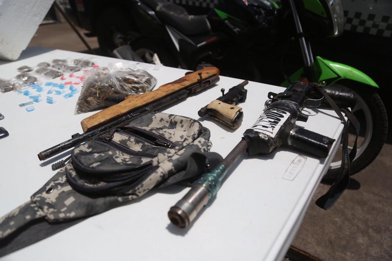 Asimismo, tras revisar la zona se encontraron tres armas de fuego de fabricación casera, varias bolsas plásticas con hierba verde seca, al parecer marihuana y sustancia granulada con las características propias de la metanfetamina; de igual forma, se ubicó una motocicleta con el Número de Identificación Vehicular esmerilado.