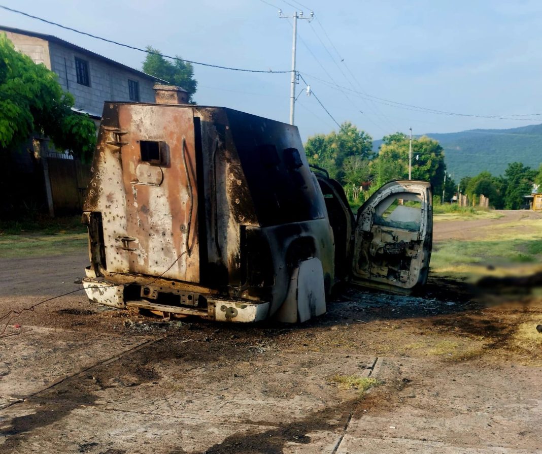 De forma inmediata hasta el sitio se trasladaron policías y elementos de Fuerzas Federales, los cuales hallaron cerca del Centro de Aprendizaje Comunitario (CCA), un vehículo con blindaje artesanal, mismo que presentaba múltiples impactos de proyectil y estaba quemado.