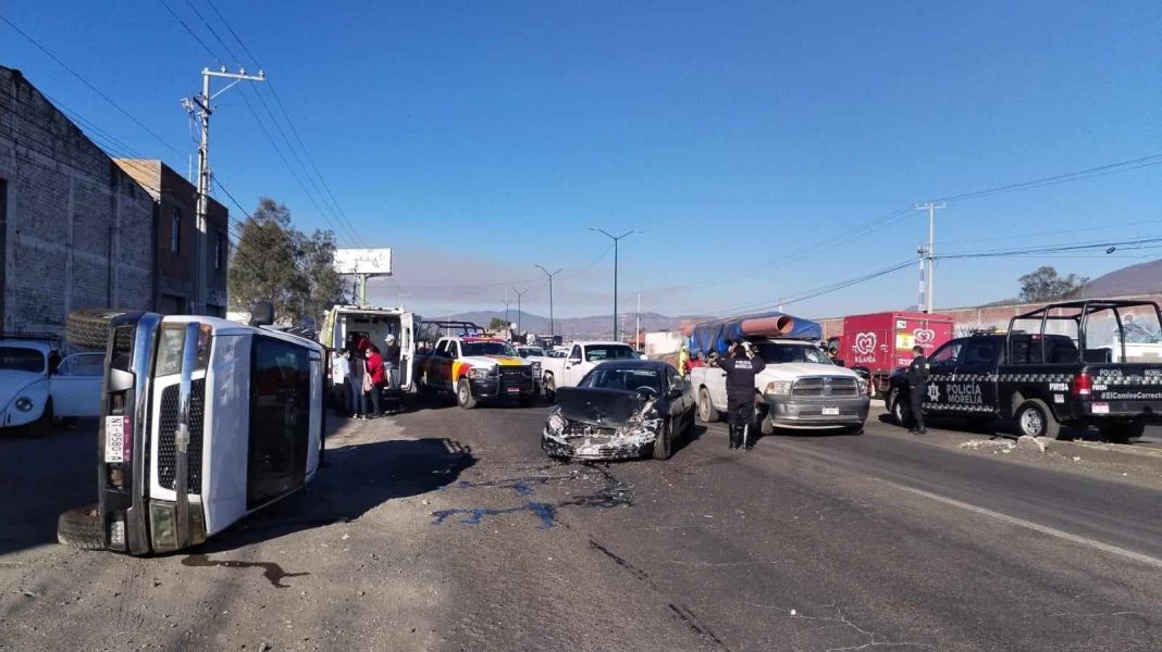 Dos vehículos protagonizaron un aparatoso choque y uno de ellos volcó sobre la avenida Madero Poniente de Morelia, en la salida a Quiroga, informaron autoridades policiales, las cuales agregaron que el hecho dejó tres heridos.