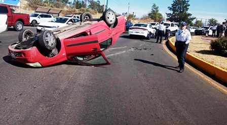 Un vehículo volcó en la Glorieta Juan Pablo II ubicada en la zona de Altozano, al sur de Morelia. Afortunadamente no hubo lesionados, comentaron autoridades policiales.