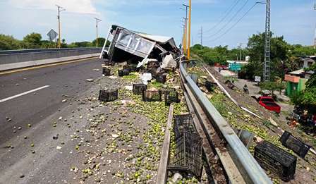 Parácuaro, Mich.- Un tractocamión cargado con varias toneladas de limón se volcó en el municipio de Parácuaro.