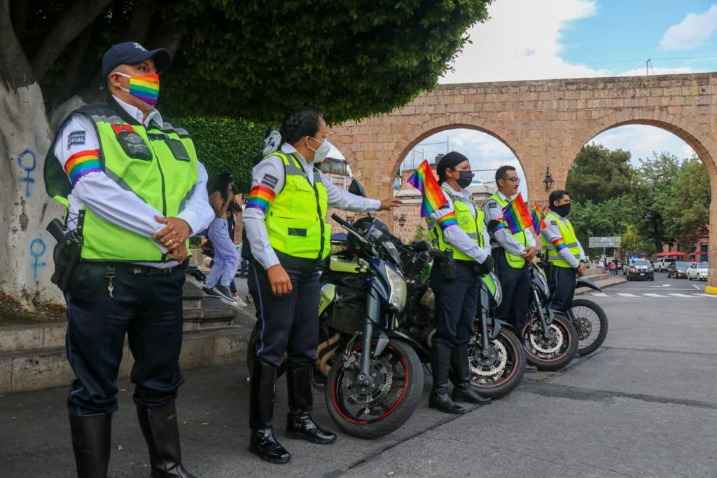 Morelia, Michoacán.- En una acción de respeto a la libertad de expresión y en aras de mantener el orden público, los elementos de la Secretaría de Seguridad Pública (SSP), brindan acompañamiento y asistencia vial a los participantes de la marcha del Pride Michoacán, que se desarrolla en el Centro Histórico de Morelia.