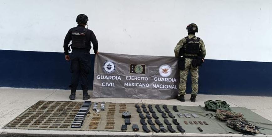 Al interior de la camioneta se localizaron los cartuchos útiles y cargadores de distintos calibres, así como tres mochilas tácticas. Una vez realizadas las actuaciones respectivas, lo asegurado fue presentado ante la autoridad competente para llevar a cabo las indagatorias que establece la ley.
