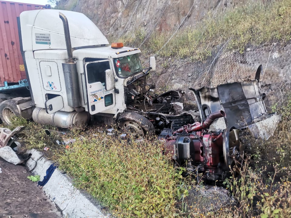 La unidad siniestrada es una de la marca Kenworth, color blanco con placas 550EH8, modelo 2013, el cual tenía acoplado un semirremolque, tipo portacontenedor, de la marca Meritor ALLFIT, color azul con placas 51TY3U, cargado con un contenedor color rojo (vacío).