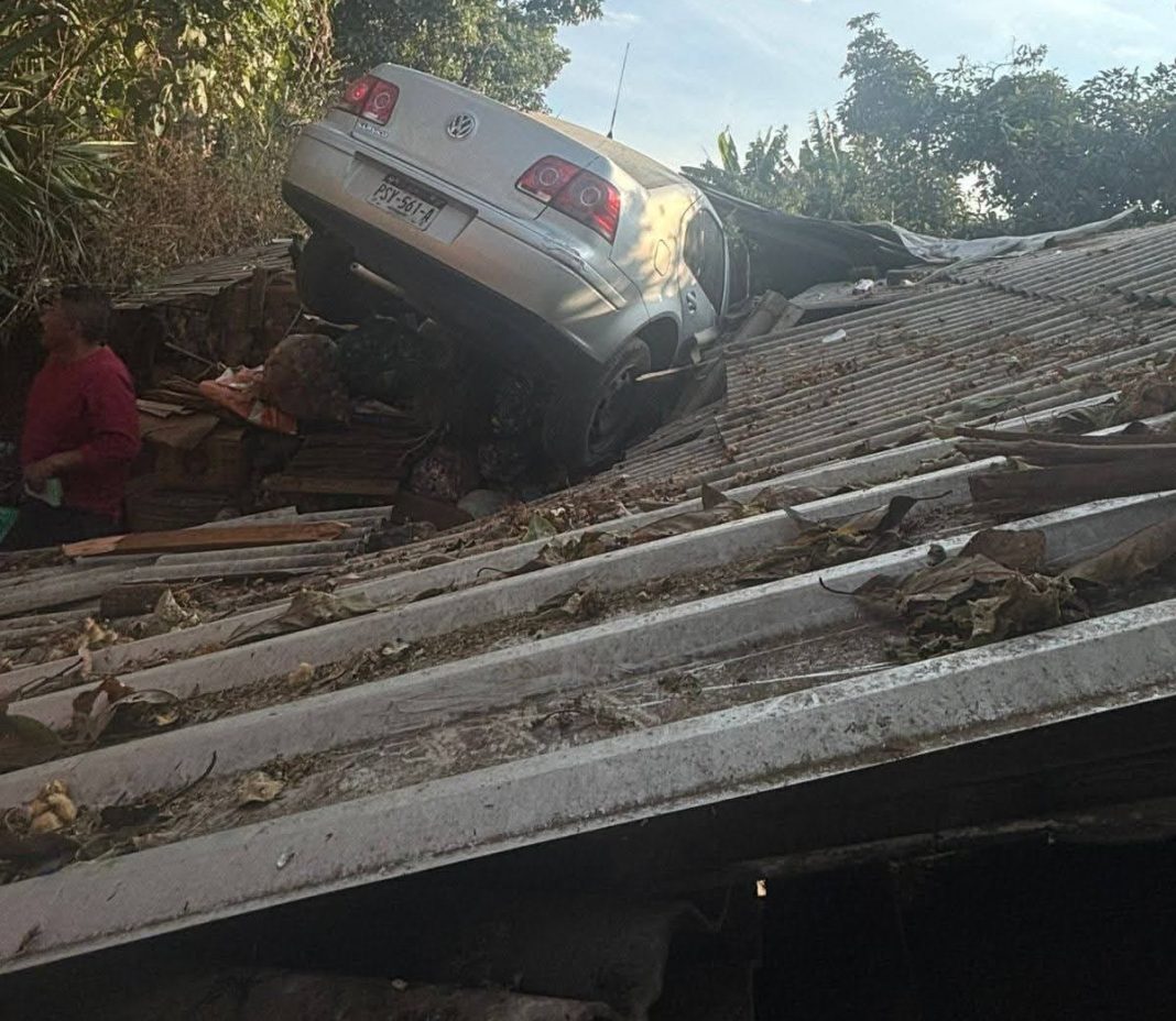 Zitácuaro, Mich.- Un automóvil cayó desde lo alto de una vialidad hacia un desnivel y terminó siniestrado sobre la techumbre de un domicilio ubicado en la colonia Pueblo Nuevo de esta ciudad de Zitácuaro. El accidente ocurrió luego de que el vehículo chocara contra una motocicleta, cuyos dos ocupantes resultaron heridos, informaron autoridades policiales y de rescate.