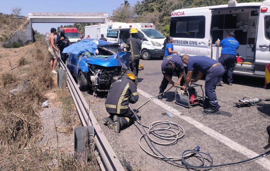 El aparatoso accidente tuvo lugar a la altura de la comunidad de Zacatula, en los límites de Guerrero y Michoacán, donde colisionaron de frente una camioneta tipo Pick-up y auto compacto de color azul, este último acabó totalmente destrozado a consecuencia del brutal impacto.
