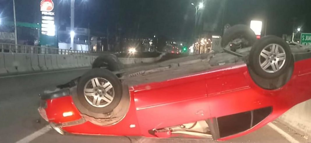Un automóvil rojo volcó sobre uno de los puentes de la avenida Madero Poniente, en la ciudad de Morelia, justo arriba del Distribuidor Vial de Salida a Quiroga, informaron fuentes cercanas al tema.