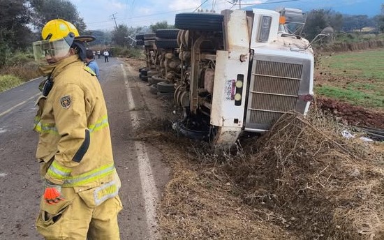 Hasta el sitio se trasladaron Bomberos Purhépechas, mismos que encontraron volcado sobre su costado izquierdo un vehículo Kenworth de color blanco, con matrícula NJ-4740-B.