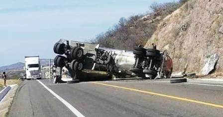La Huacana, Mich.- Un tráiler que remolcaba dos contenedores tipo pipa cargados con miles de litros de aceite volcó en la autopista Siglo XXI, lo que provocó derrame del liquido sobre el asfalto.