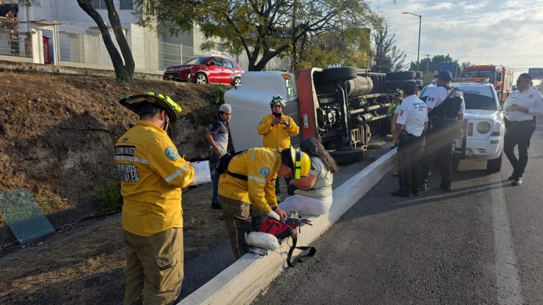 Los rescatistas atendieron a dos adultos y un adolescente que viajaban en la unidad, quienes resultaron ilesos y no requirieron traslado hospitalario. El vehículo es de la marca Freightliner, color blanco, con matrícula NS4819B.