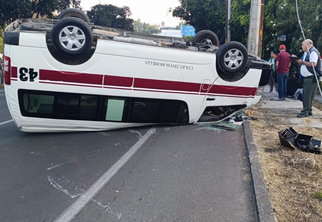El aparatoso incidente se registró en el sentido de Fuentes de Morelia hacia Casa Michoacán, donde terminó volcada una camioneta de la Ruta Guinda, con número económico 43.