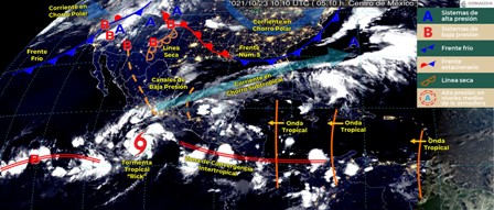 Pacífico Sur: Cielo nublado durante el día, con lluvias puntuales torrenciales y descargas eléctricas que podrían generar deslaves e inundaciones en zonas de Guerrero y Oaxaca, así como muy fuertes en Chiapas. Ambiente fresco por la mañana. Bancos de niebla matutinos en zonas serranas. Ambiente cálido por la tarde en zonas costeras. Viento del este y sureste con rachas de 60 a 70 km/h en la región y oleaje de 2 a 4 metros de altura en las costas de Guerrero.