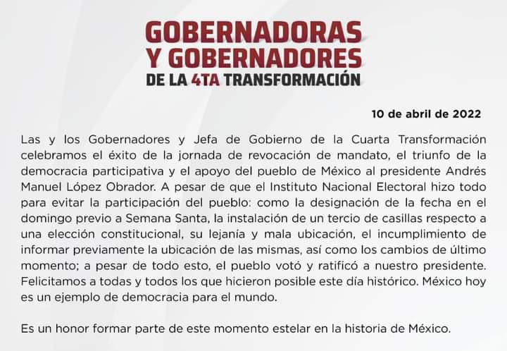 «Las y los gobernadores y Jefa de Gobierno de la cuarta transformación celebramos el éxito de la jornada de revocación de mandato del triunfo de la democracia participativa y el apoyo del pueblo de México al presidente Andrés Manuel López Obrador.