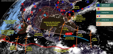Para hoy, un canal de baja presión que se extenderá desde el noroeste hasta el occidente del país y el paso de la onda tropical Núm.14 al sur de las costas de Jalisco, mantendrán la probabilidad de chubascos y lluvias fuertes acompañadas de descargas eléctricas y posibles granizadas sobre los estados del noroeste, norte y occidente de México, llegando a registrarse lluvias puntuales muy fuertes en Sonora, Chihuahua, Sinaloa y Durango. Por otra parte, un canal de baja presión sobre el sureste del territorio nacional y la entrada de humedad del Océano Pacífico ocasionarán lluvias con intervalos de chubascos y descargas eléctricas sobre la Península de Yucatán, sureste, oriente y centro del país. Finalmente, se prevé ambiente caluroso a muy caluroso en la Península de Yucatán, sureste y en los estados fronterizos del norte de México, pronosticándose temperaturas máximas de 40 a 45°C en Baja California y Sonora.