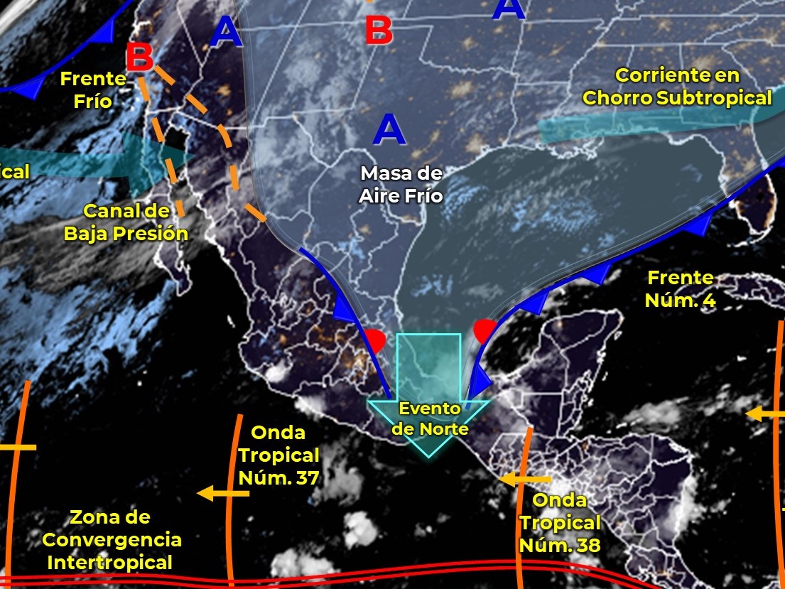 La masa de aire frío que impulsa al frente provocará evento de Norte con rachas de 60 a 70 kilómetros por hora (km/h) en el Istmo de Tehuantepec y de 50 a 60 km/h en las costas de Veracruz; oleaje de 2 a 3 metros (m) de altura en el Golfo de Tehuantepec y de 1 a 2 m en el litoral de Veracruz, así como ambiente matutino de frío a muy frío, con probabilidad de heladas en zonas altas de los estados que conforman la Mesa del Norte y la Mesa Central.