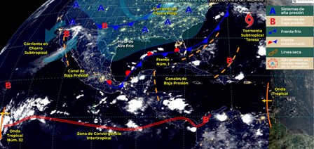 Este día, el frente Núm. 1 continuará semiestacionario en el sur del Golfo de México mientras que un canal de baja presión se extenderá sobre la Sonda de Campeche, dichos sistemas generarán lluvias fuertes a muy fuertes y descargas eléctricas en el sureste mexicano y la Península de Yucatán. Otro canal de baja presión se extenderá desde el norte hasta el occidente del territorio nacional y, en interacción con la entrada de humedad proveniente del Océano Pacífico, originarán lluvias con tormentas eléctricas y posibles granizadas sobre Chihuahua, Durango, Sinaloa, Nayarit, Jalisco, Colima, Michoacán y Guerrero. Un vórtice en niveles altos de la atmósfera mantendrá las condiciones para chubascos y lluvias fuertes en el noroeste de México. También, prevalecerá ambiente muy caluroso en la Península de Yucatán y en zonas del noroeste del país.