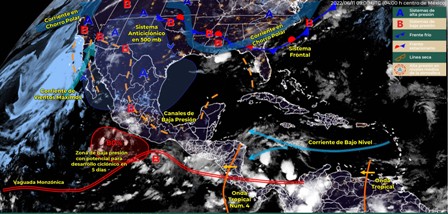 Para hoy, la integración de la onda tropical Núm. 3 a la zona de baja presión con potencial ciclónico que se desplazará al sur de las costas de Guerrero y la vaguada monzónica extendida frente a la costa sur del Pacífico mexicano, mantendrán el temporal de lluvias fuertes a intensas que podrían ocasionar deslaves e inundaciones en zonas del oriente, sur y sureste de México. Por su parte, canales de baja presión, en combinación con el ingreso de aire cálido y húmedo proveniente de ambos océanos, producirán chubascos y lluvias puntuales fuertes con descargas eléctricas y posibles granizadas en el noroeste, norte y occidente del país. La nueva onda tropical Núm. 4 se desplazará al sur de la Península de Yucatán e incrementará la probabilidad de lluvias puntuales muy fuertes en Chiapas. Finalmente, la circulación anticiclónica en niveles medios de la atmósfera mantendrá ambiente caluroso a muy caluroso en la mayor parte del país, con temperaturas máximas extremadamente calurosas, por arriba de los 45°C, en zonas de Baja California.