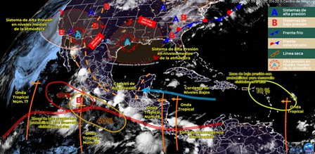Para hoy, la onda tropical Núm. 18 se asociará con una zona de baja presión con probabilidad de desarrollo ciclónico al sur de las costas de Jalisco, y por la tarde, dicha onda tropical interaccionará con un canal de baja presión, originando lluvias de fuertes a muy fuertes acompañadas de descargas eléctricas y posibles granizadas en el noroeste, occidente y centro del país, con puntuales intensas en el norte de Sinaloa. Por otro lado, una nueva onda tropical Núm. 19 se desplazará al sur de la Península de Yucatán e interaccionará gradualmente con un canal de baja presión sobre el sureste mexicano, generando lluvias puntuales intensas en Oaxaca y Chiapas, muy fuertes en Puebla y Veracruz, así como fuertes en Campeche, Yucatán y Quintana Roo. Finalmente, prevalecerá el ambiente muy caluroso en el noroeste de México con temperaturas máximas que pueden superar los 40°C en el noroeste de Sonora y norte de Baja California.