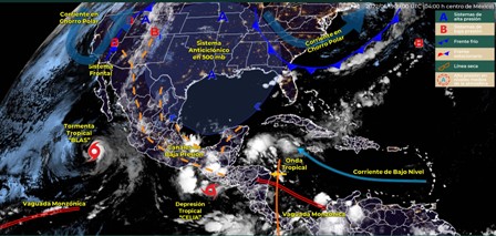 Para hoy, la depresión tropical “Celia” se localizará al sur de Chiapas y continuará interactuando con dos canales de baja presión: uno extendido sobre el suroeste del Golfo de México y otro en la Península de Yucatán, lo que mantendrá el temporal de lluvias puntuales muy fuertes a intensas acompañadas de descargas eléctricas sobre entidades del oriente y sureste del país, incluida la Península de Yucatán. Las lluvias mencionadas podrían originar incremento en los niveles de ríos y arroyos, inundaciones y deslaves. Un canal de baja presión extendido desde el occidente de la Mesa del Norte hasta la Mesa Central, en interacción con divergencia en altura y con el ingreso de humedad de ambos litorales, producirán lluvias con chubascos vespertinos y lluvias puntuales fuertes acompañadas de descargas eléctricas y posible caída de granizo, sobre sobre el noroeste, occidente y centro de la República Mexicana, incluido el Valle de México. A su vez, una circulación anticiclónica en niveles medios de la atmósfera, mantendrá el ambiente vespertino cálido a caluroso sobre entidades del noroeste, norte y noreste del territorio nacional, con temperaturas máximas muy calurosas, superiores a 40°C, en zonas de Baja California, Sonora, Chihuahua, Sinaloa, Coahuila, Nuevo León y Tamaulipas. La tormenta tropical “Blas” seguirá desplazándose hacia el noroeste, alejándose de las costas mexicanas.