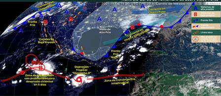 Golfo de México: Cielo medio nublado durante el día. Lluvias puntuales fuertes en Veracruz, intervalos de chubascos en Tabasco y lluvias aisladas en Tamaulipas. Ambiente fresco por la mañana. Bancos de niebla matutinos en zonas altas y temperaturas frías matutinas con posibles heladas en sierras de Veracruz. Ambiente templado a cálido por la tarde. Viento de componente norte de 15 a 30 km/h con rachas de 40 km/h en la región.